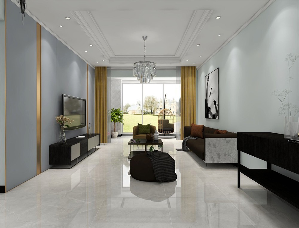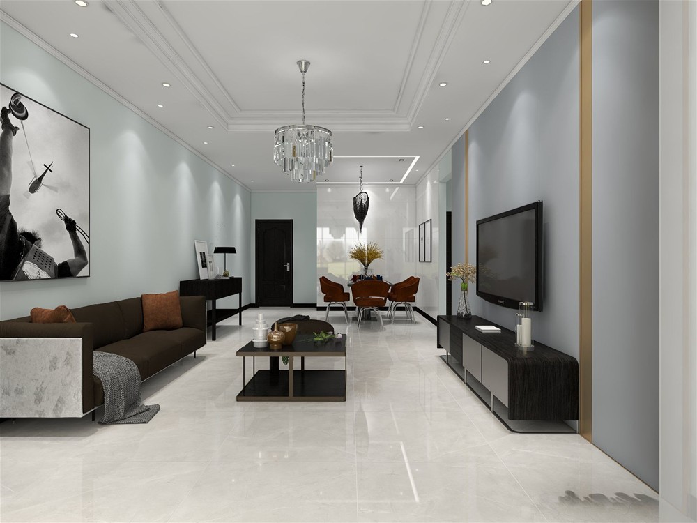 客厅以黑白灰为主色调,整个空间以简洁明朗的线条组合,电视背景墙用金色材质点缀,地砖铺贴潘多拉灰艾釉石,提亮了整个空间。