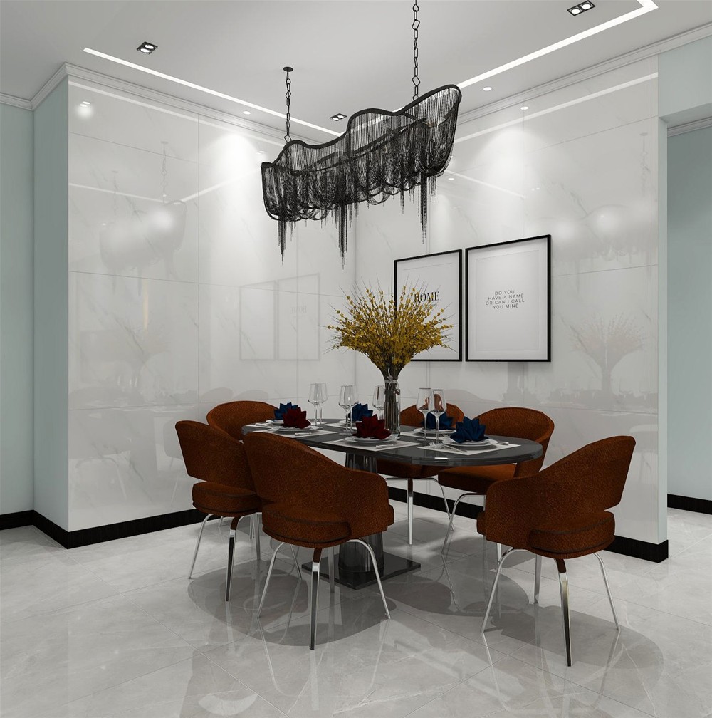 餐厅的色彩和质地是整个大空间的美好衍生,餐椅的布艺软包沿用了高调的橙色,搭配爵士白餐厅背景墙,吊灯是创意十足的流苏元素,带来了十分惬意的用餐感受。