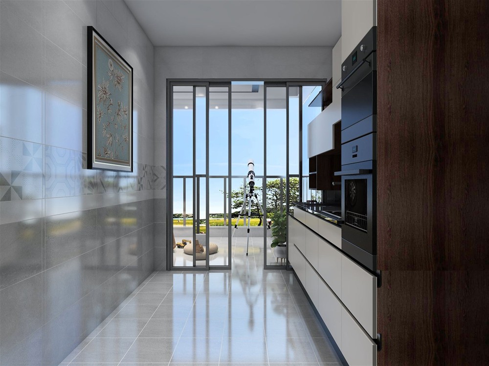 开放式厨房与阳台相通,厨房用玻璃门相隔,阳光挥洒进来,干净明亮的厨房会让下厨的人拥有一个清新愉悦的舒适体验。