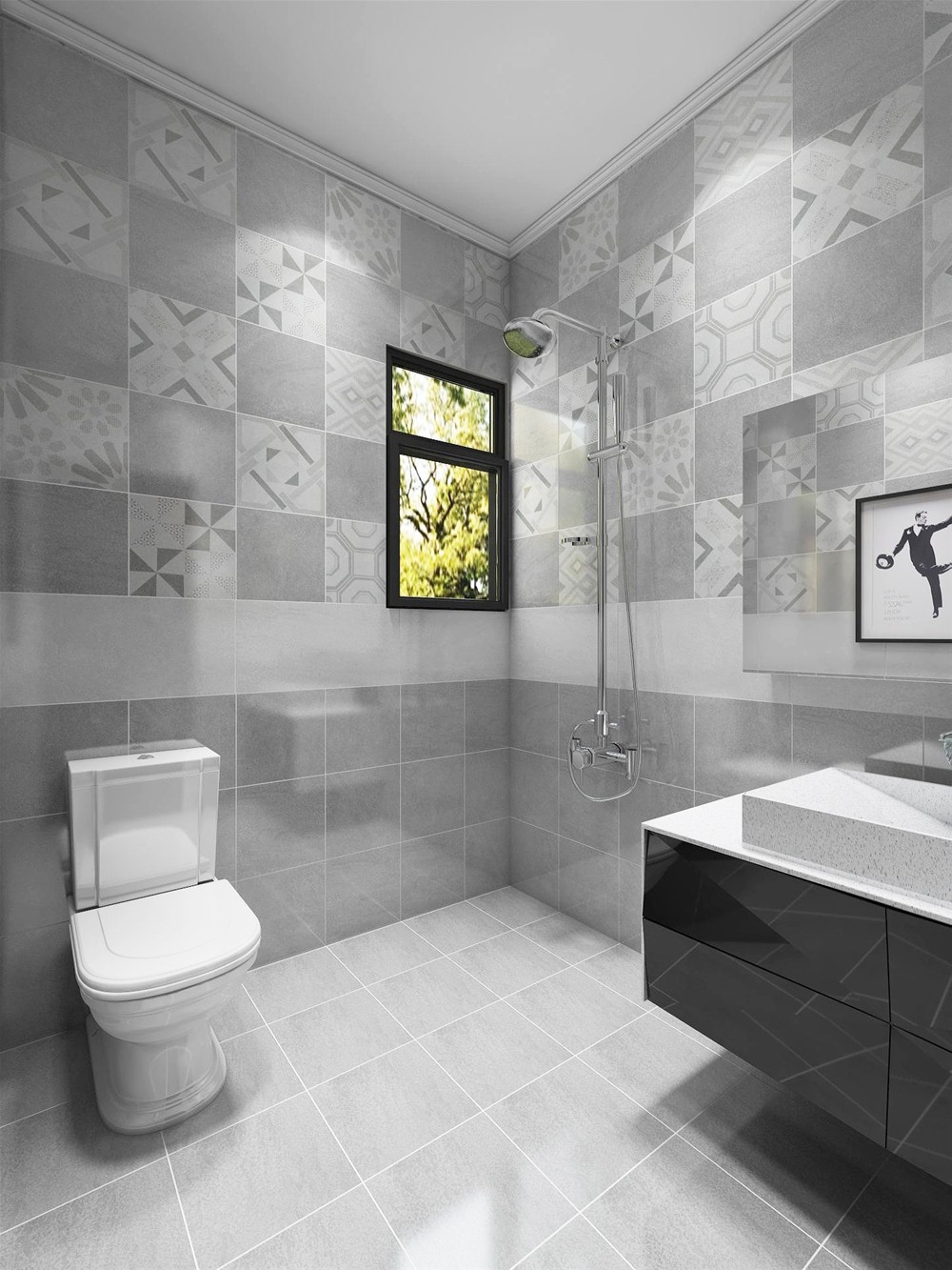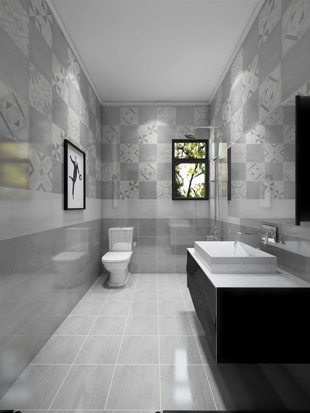 家用卫生间讲究私密性,设计师选用浅灰色的喷墨瓷片,这是一款应用范围广泛的产品,一深一浅与花片搭配使用让空间不会过于单调。