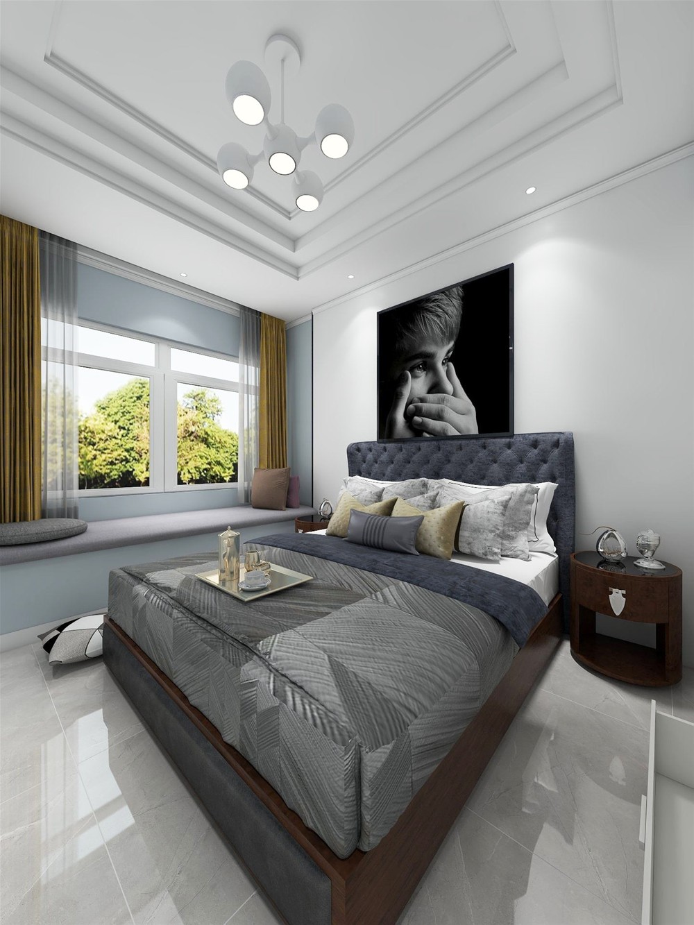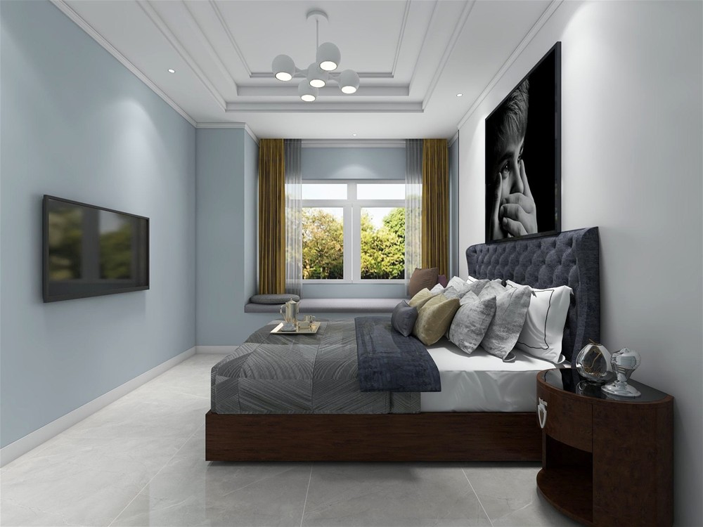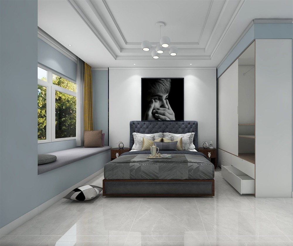 以灰色调为基调,地砖选用浅灰色艾釉石,大床选用相对地砖深一点的灰色,层次分明。