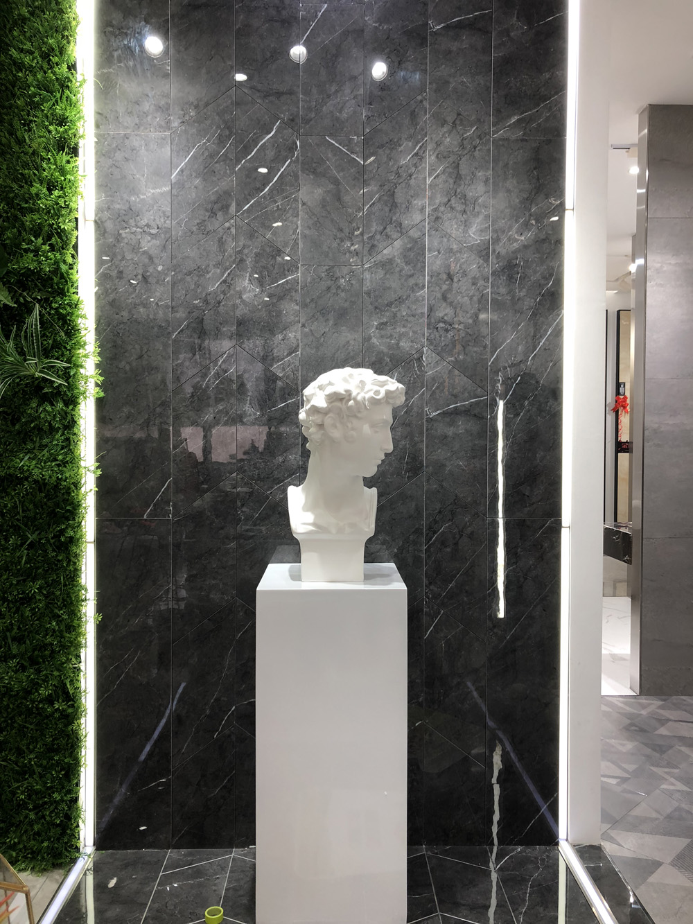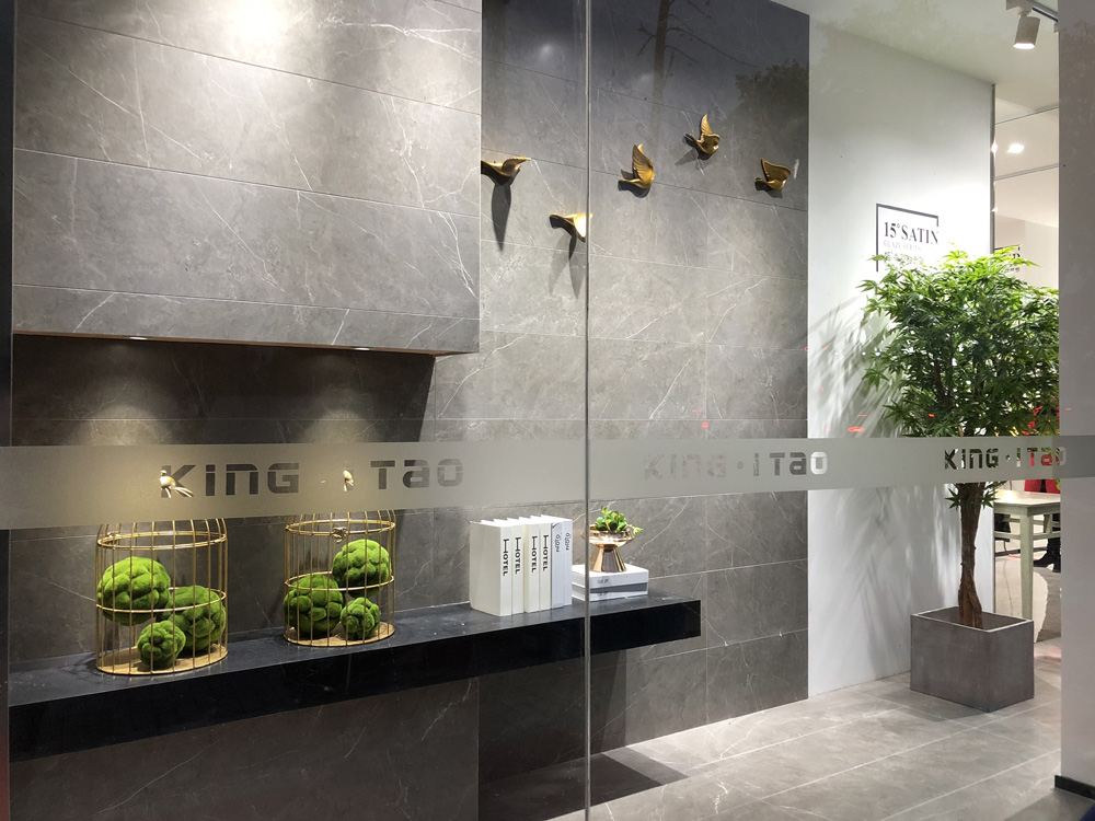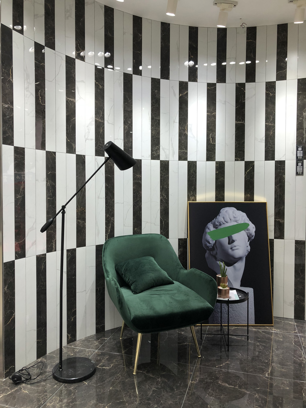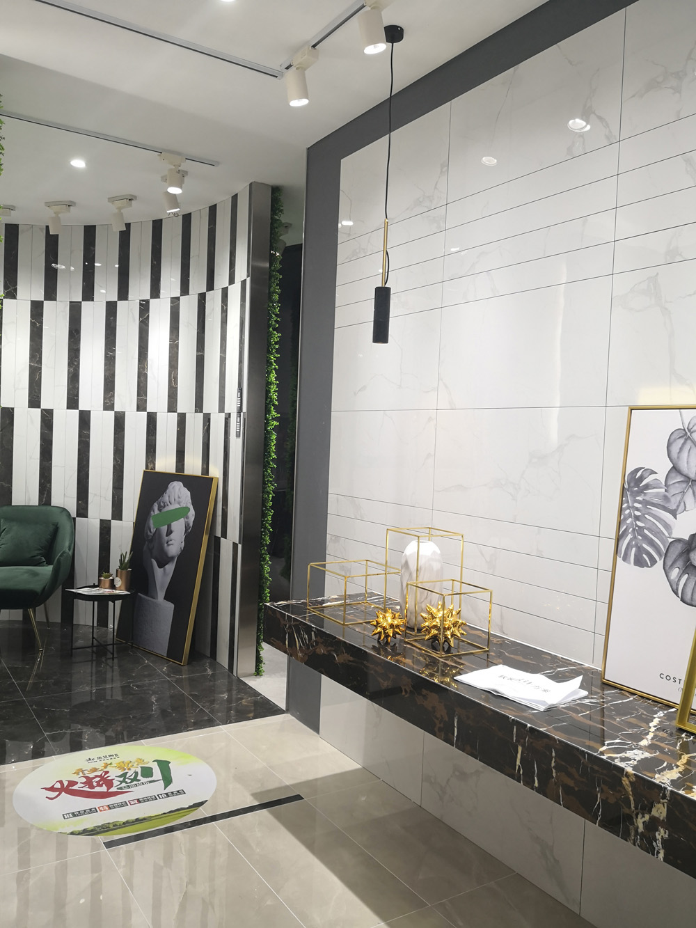 这是91短视频在线观看陶浙江嵊州青春馆的前台,由灰色九面通体大理石铺贴的背景墙,形象台由缎光釉卡拉卡白铺贴而成,可塑性非常强的一款产品。简洁大气的前台延续了青春馆的现代简约风格。