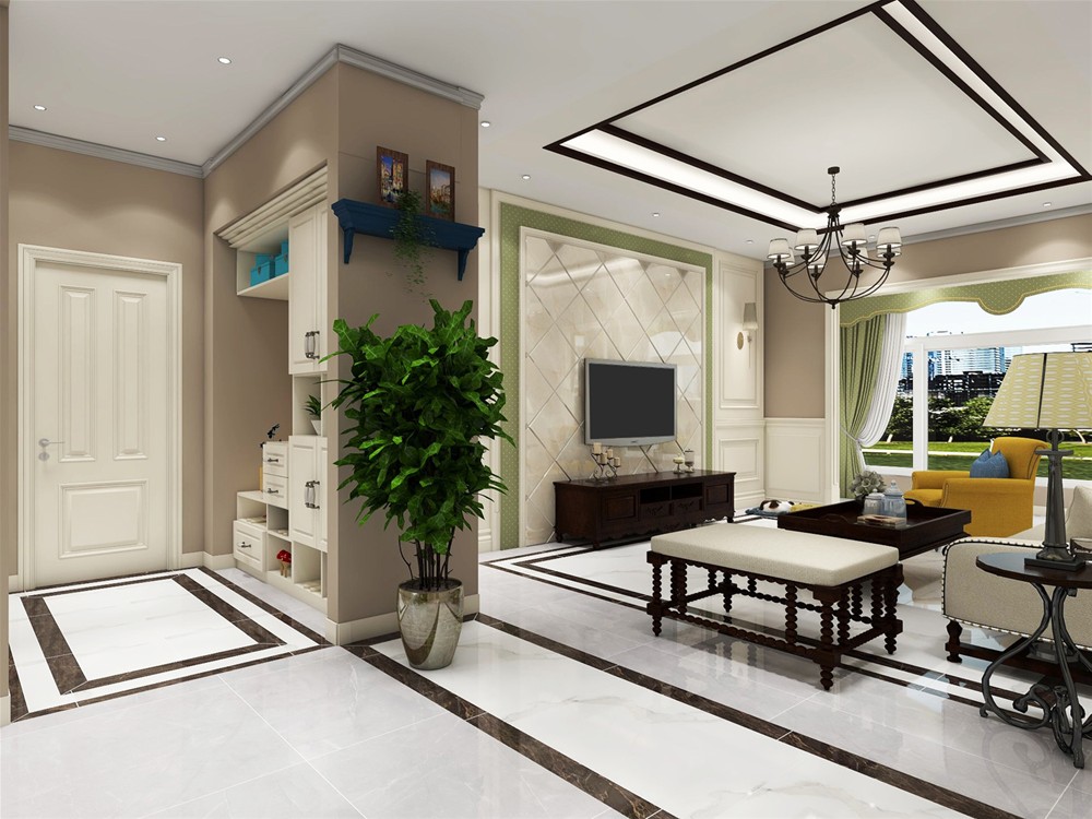 美式田园风格对植物的选择有着较高的要求,一般来说选择的多数是不开花的绿色植物,可以均匀的分布在客厅茶几旁、装饰柜旁等等,形成错落有致的格局。