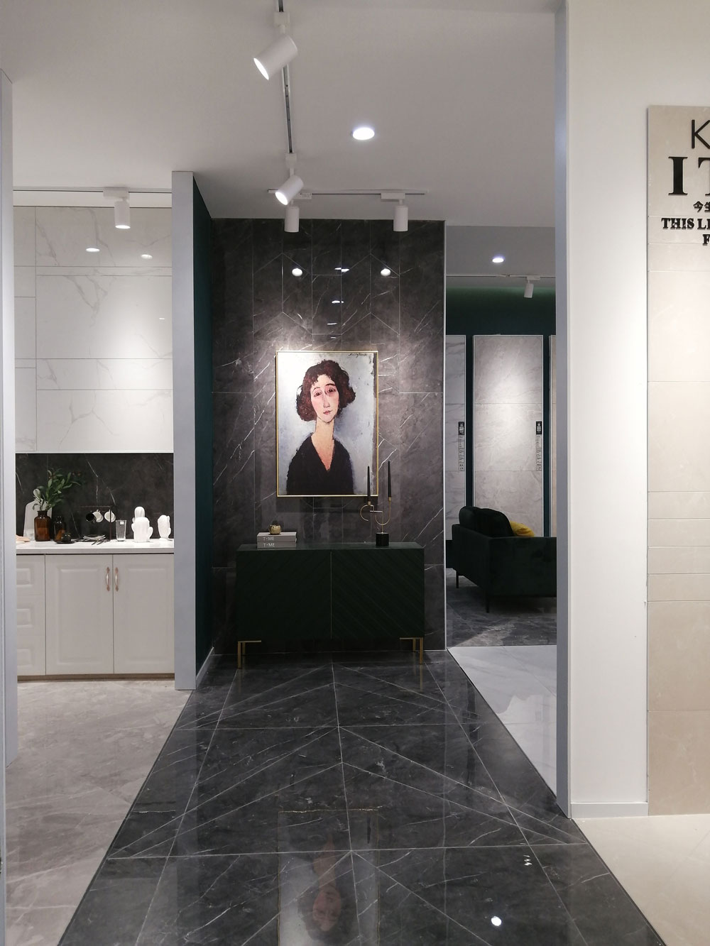 这是现代简约过道,由通体大理石闪电灰KA9M61207铺贴,整个过道以灰色调为主,墙面墨绿色的墙面点缀,让过道富有张力,直铺的方式延伸了整条过道的宽度和长度。有没有想过您家过道用这款砖呢?躺着拍、站着拍、斜着拍,都没问题!