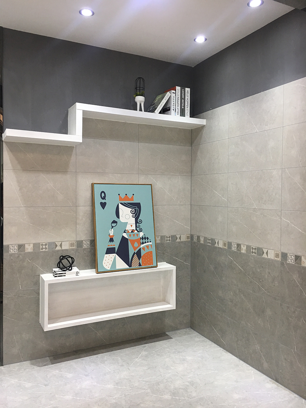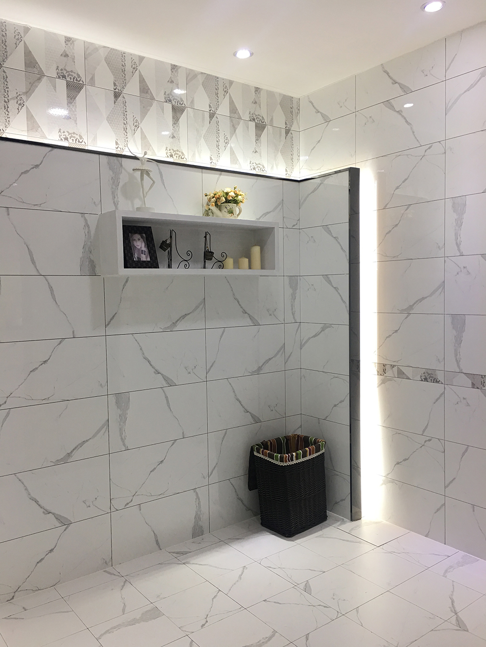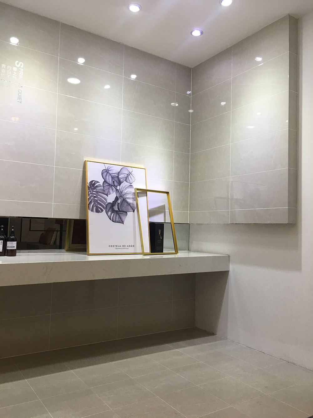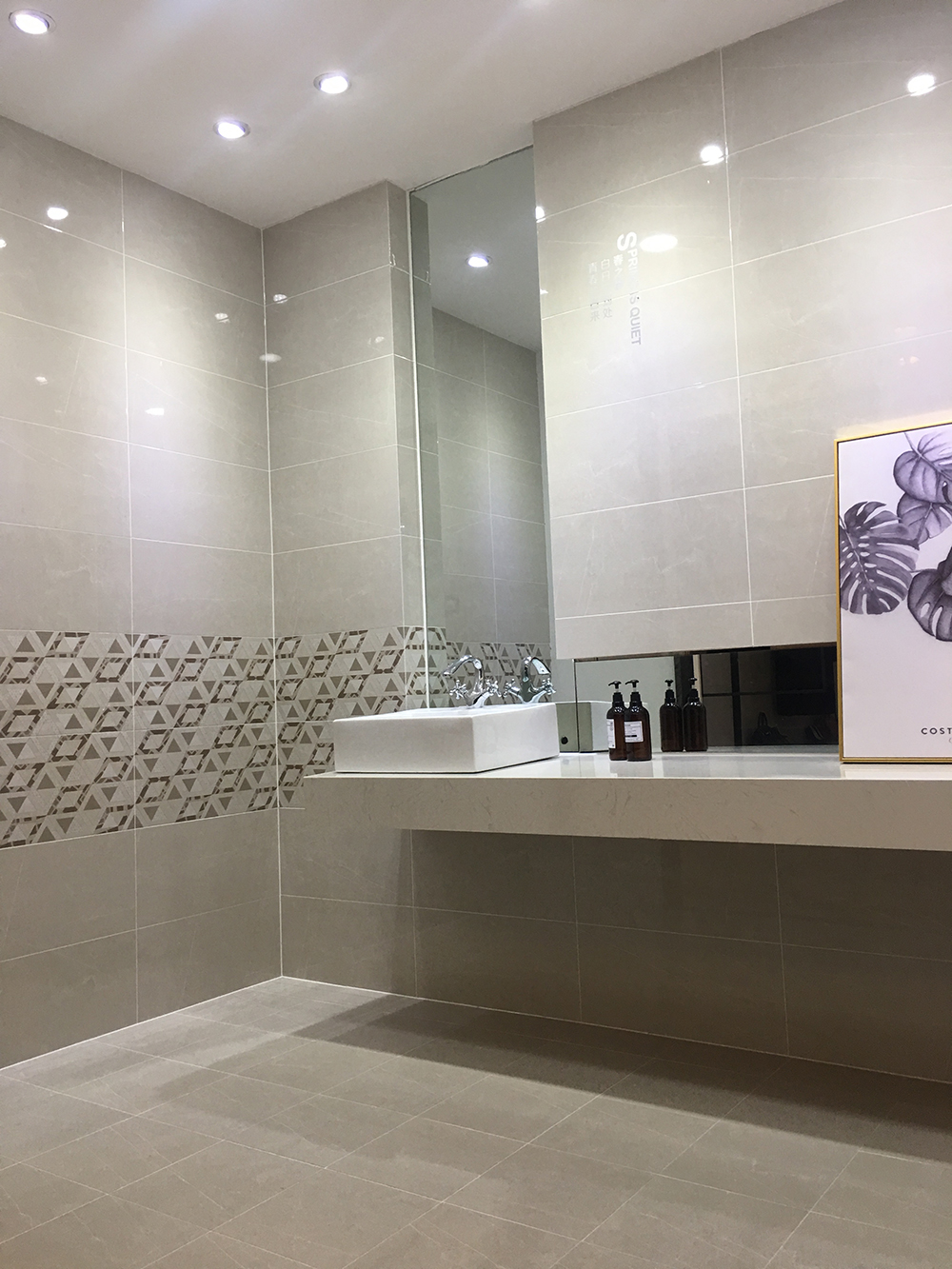墙面顶部把花片切割成100*600铺贴,规避了头重脚轻