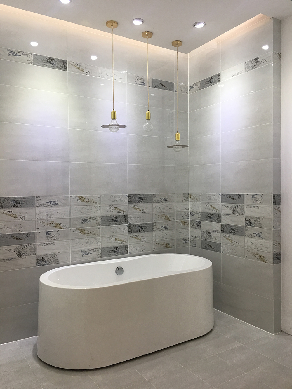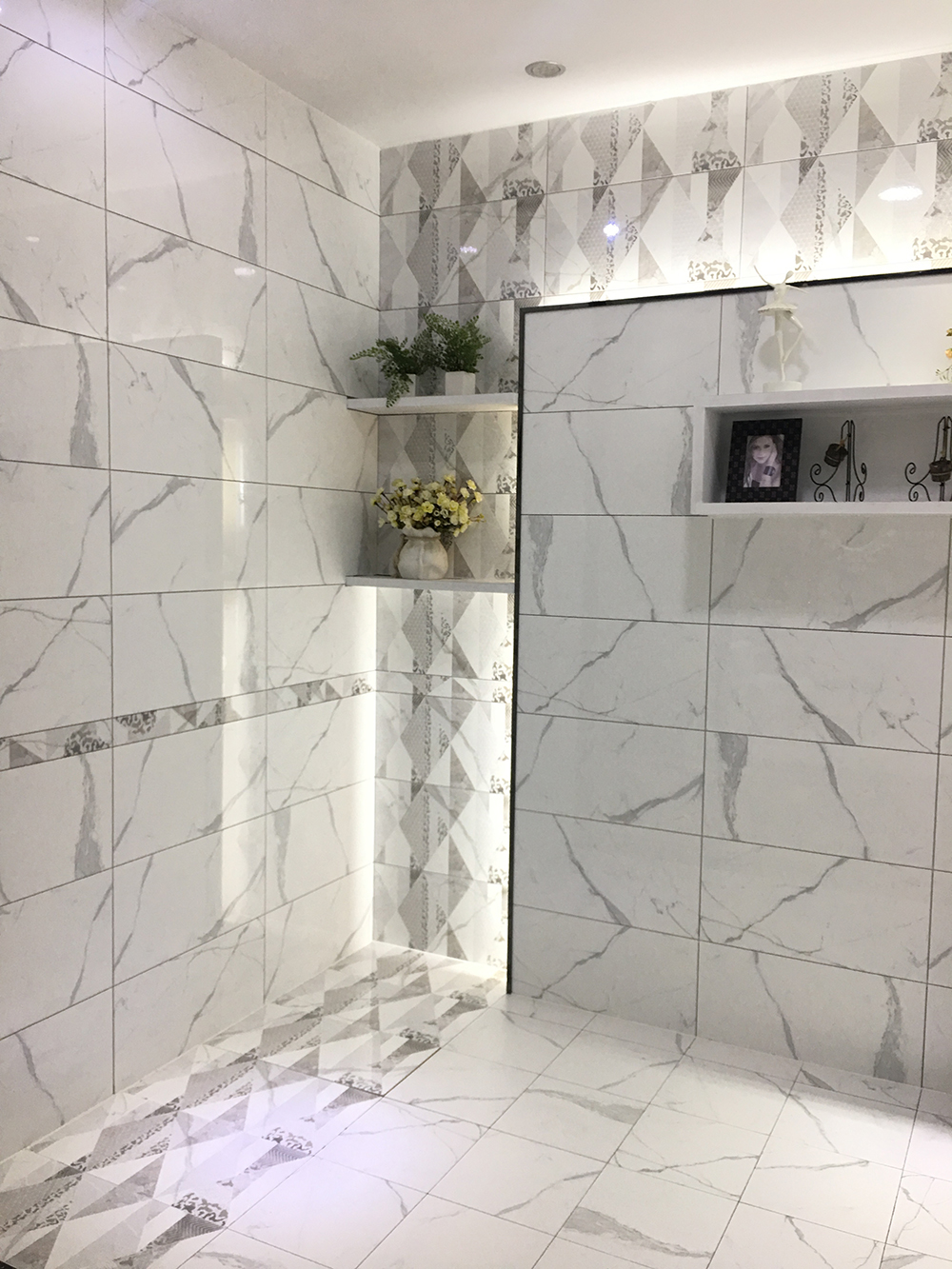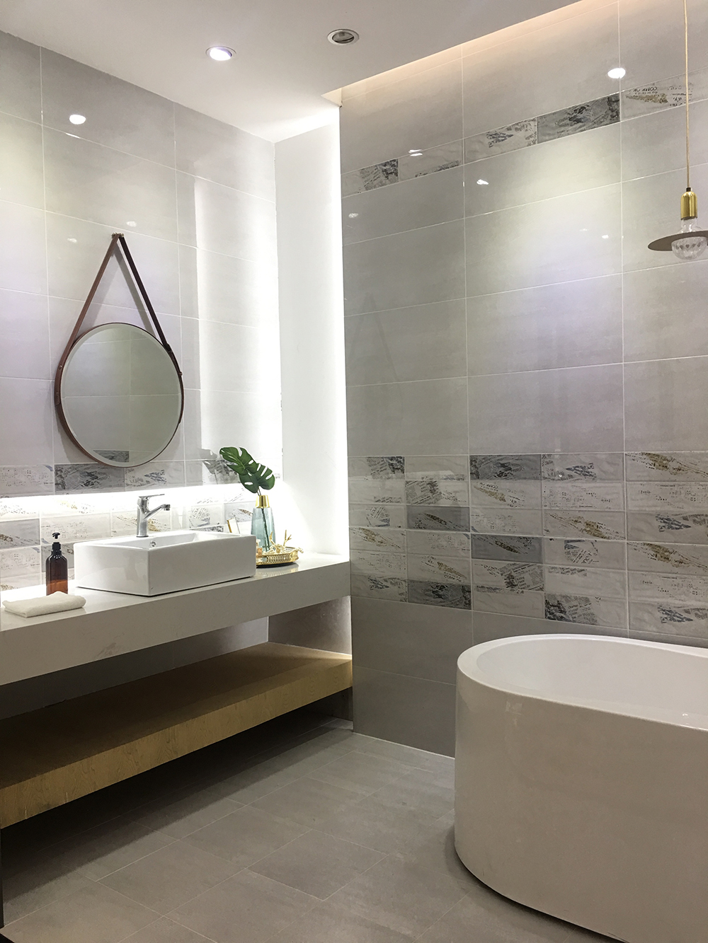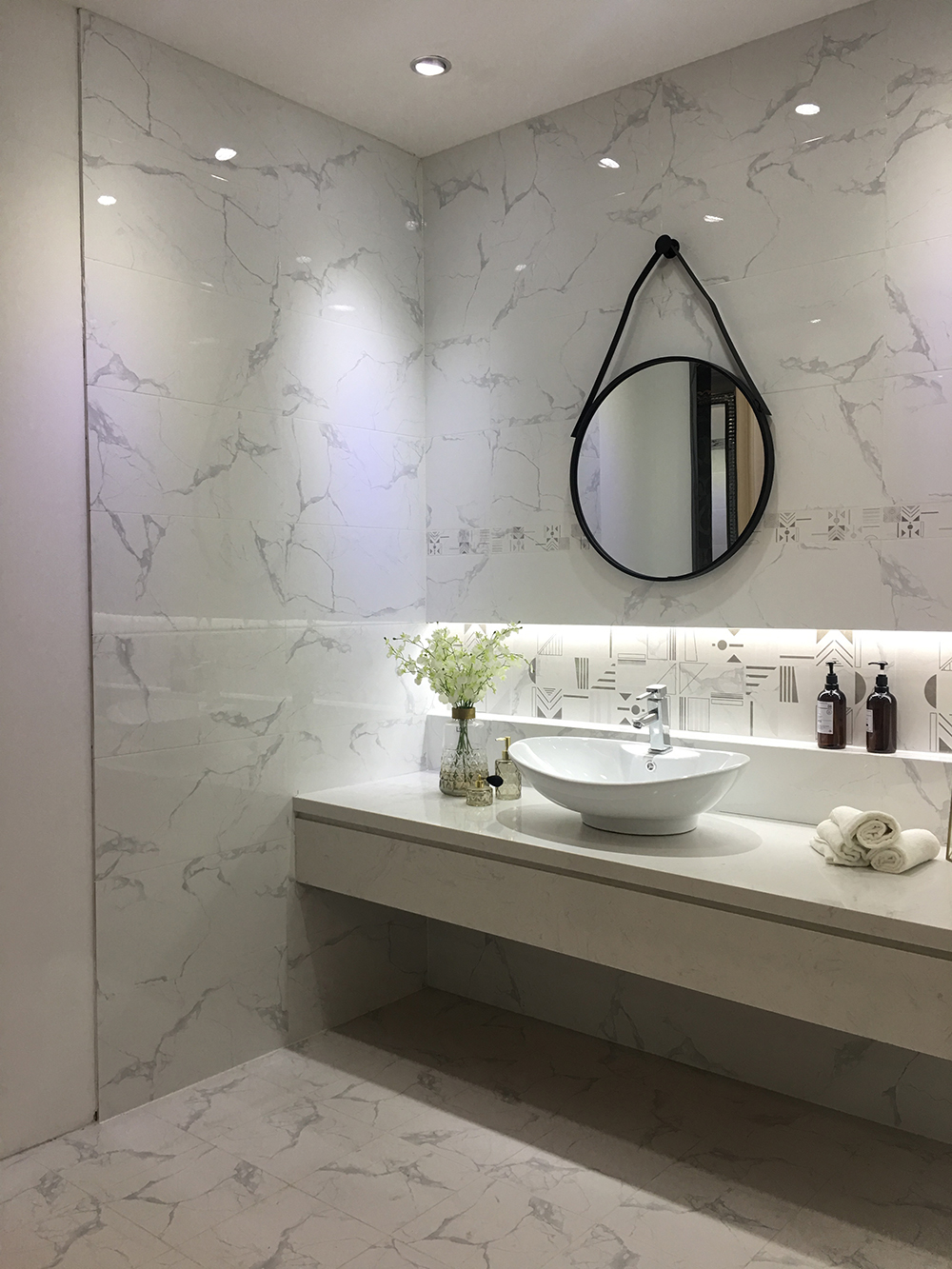 墙面顶部把花片切割成100*600铺贴,规避了头重脚轻