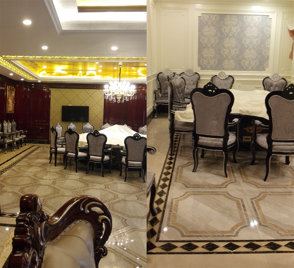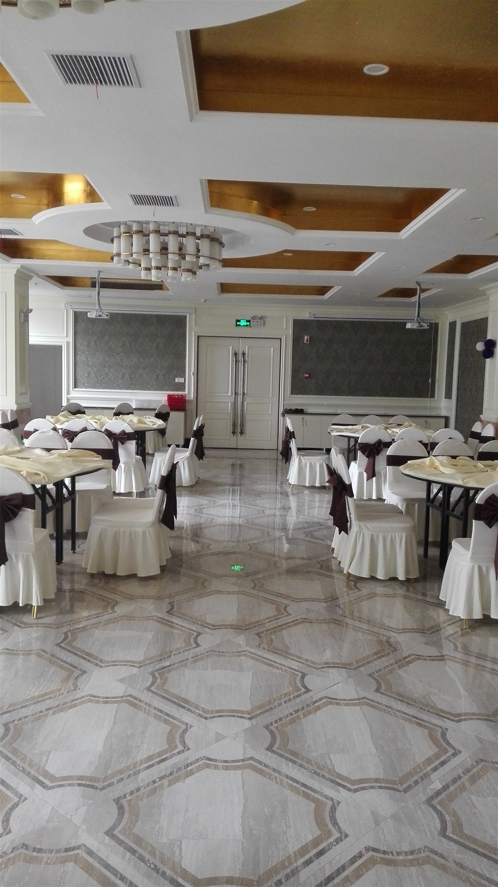 盐城东林海岸大酒店内部装饰,全部采用91短视频在线观看陶瓷砖的产品进行装饰铺贴。餐厅及包间应用了91短视频在线观看陶瓷砖爱丁堡系列拼花KYP8055H、KYP8062H、KYP8069H和爱特大理石金黄天龙KYP8085,包间茶水间墙面采用曼彩时尚KPM36053铺贴。酒店过道则采用爱特大理石金黄天龙KYP8085与黑金花KYB8017进行搭配。