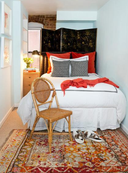 全白当然是小卧室最好的选择,但是你也可以在谨慎的考虑过后,添加一两种自己喜欢的色彩。如图中,用少量的红色和橙色,搭配做工精美的砖墙和木制家具,作为白色墙壁最好的点缀,营造轻松的居住氛围。