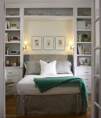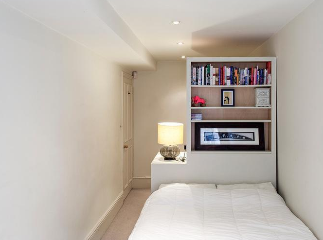 用床头板进行储物是一种极其智慧的充分利用空间的方式。这样的床头板集书橱和床头柜的功能于一身。有的时候床头板的背面还可以打造成衣橱,简直是一举多得!