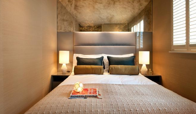 使用镜子是扩大视觉空间的绝招。特别是针对小型的卧室,一个带有镜子的墙面,至少可以让空间扩大两倍。镜子不仅对空间起到微妙的作用,同时它也是一件优雅的装饰品。