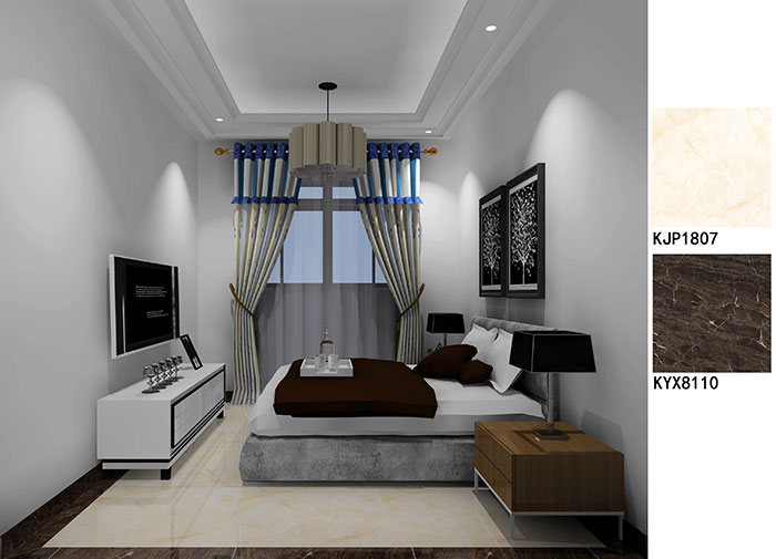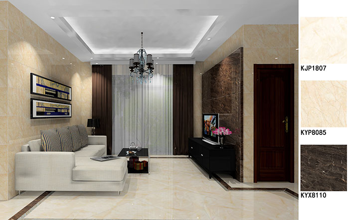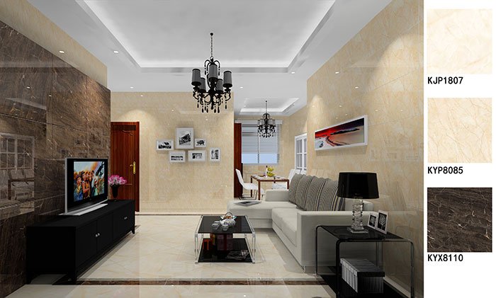 客厅没有多余的饰物,少了一分繁杂,多了一分悠然。墙面铺贴大理石瓷砖金黄天龙(浅),地面铺贴金刚釉Ⅱ代瓷砖玲珑玉,整体望去给人以温馨舒适之感。