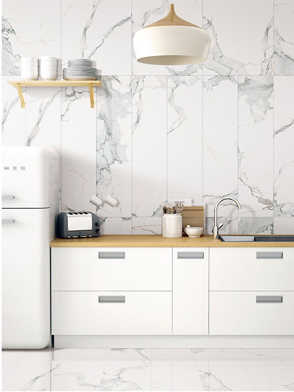 通体大理石瓷砖在瓷砖坯体上深度接近的还原天然石材岩层质变效果,纹理质感通透更强;干拌、湿拌、分管道下料技术,从坯体底层到面釉层做到表里如一,整个砖体从任何角度及任何切割方法都能达到完美的纹理呈现效果,做到真正的纹理通体;通体大理石瓷砖产品经过高吨位压机压制成型及高温烧制,成品砖坯色泽更加细腻,性能和品质更高。