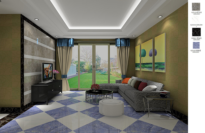 地面以蓝、白色为主,给人一种小清新的感觉。在瓷砖的铺贴方式上也蛮是新意,地面的菱形铺贴,电视背景墙的宽、窄长条形铺贴,让家不在显得单调无味。