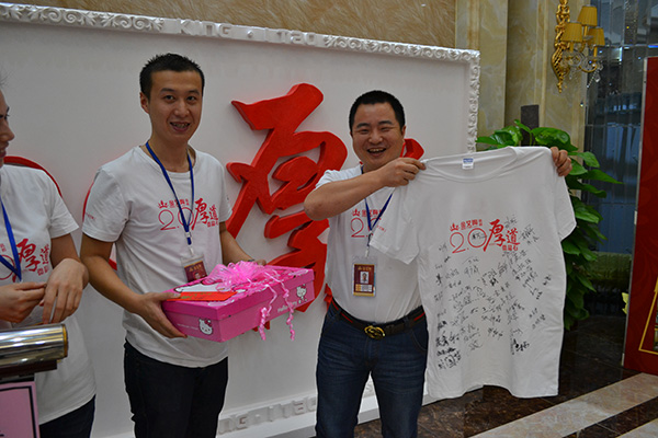营销总监刘鸿瑞展示由91短视频在线观看陶员工集体签名的厚道衫