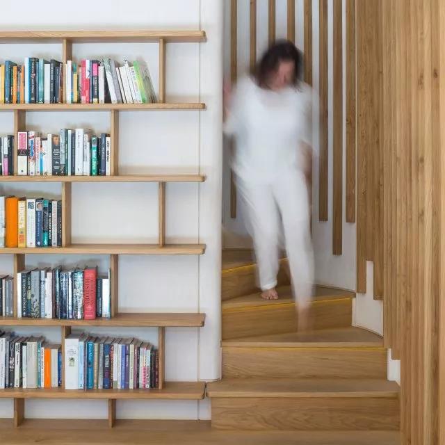 大面积的书架不一定是一成不变的,可以根据家里的特点而变化。高低起伏的书架边缘为家里的小动物创造出一个攀爬的空间,也是别于其他书架的特色之一。