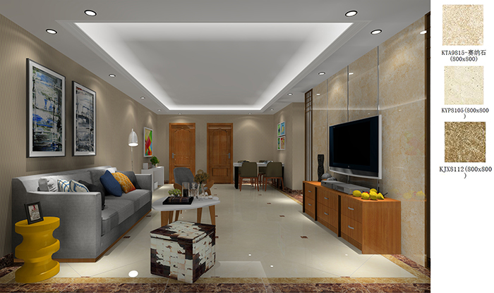 客厅:浅色调为主,背景墙选用淡黄色大砖铺贴,沙发选择简易灰色布艺沙发,整体现代感十足。