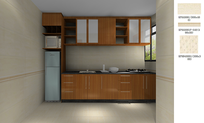 厨房:地板和墙面延续了相同色调,所以橱柜做成了木纹色,显得非常整洁。