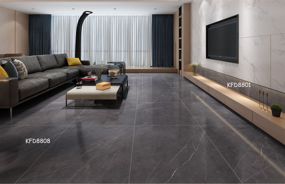 灰色调15º缎光釉铺贴的客厅,它既不浓妆艳抹,也不轻描淡写,紧抓80、90后消费者的审美:简单、随意、个性,在软装上,更是注重细节的表现,灰色无论与黑白搭配,还是被黄色如此明亮的颜色点缀,灰色肌理的变化都是多姿多彩,给空间无限的美感。
