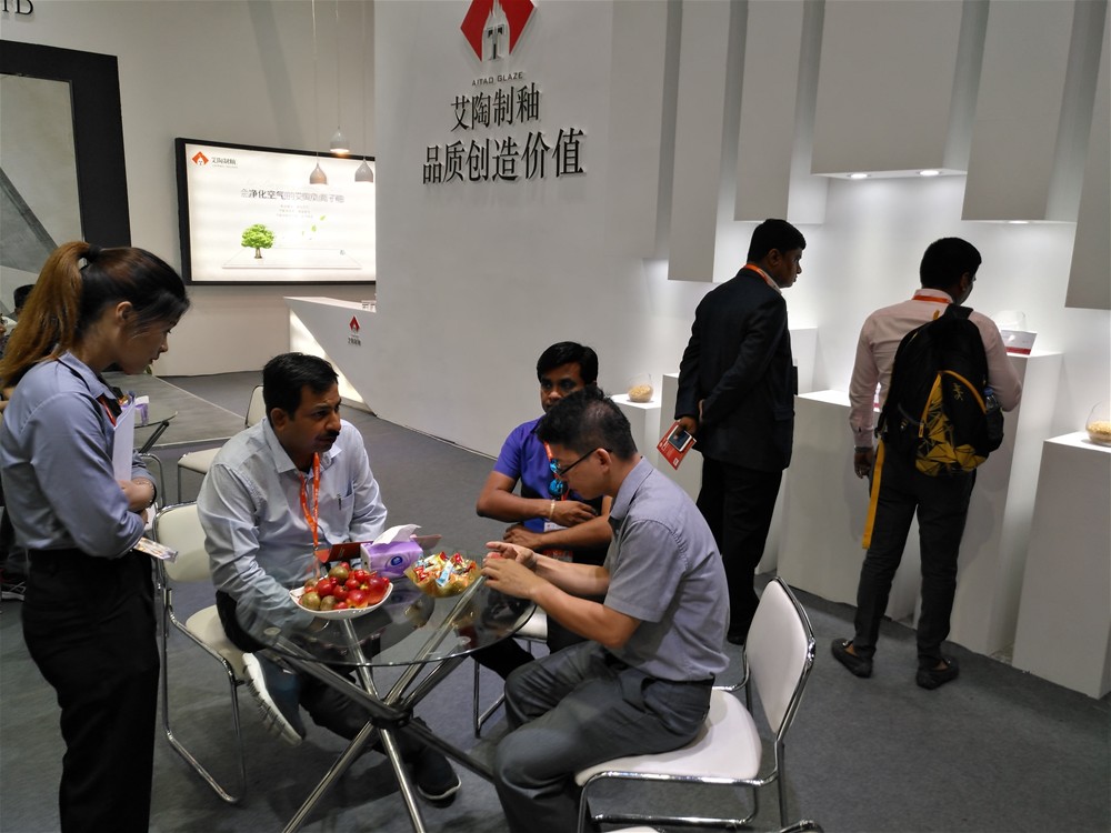参展首日,艾陶制釉展位门庭若市。此次艾陶制釉展位有200多平方,集时尚和实用于一体的展位吸引了不少不同年龄段以及国外的参展客户。真正杜绝家居环境光污染的新兴之秀“无光釉”备受好评,这无疑是对执着探索,不断开拓创新的艾陶制釉研究人员工作的最好肯定。