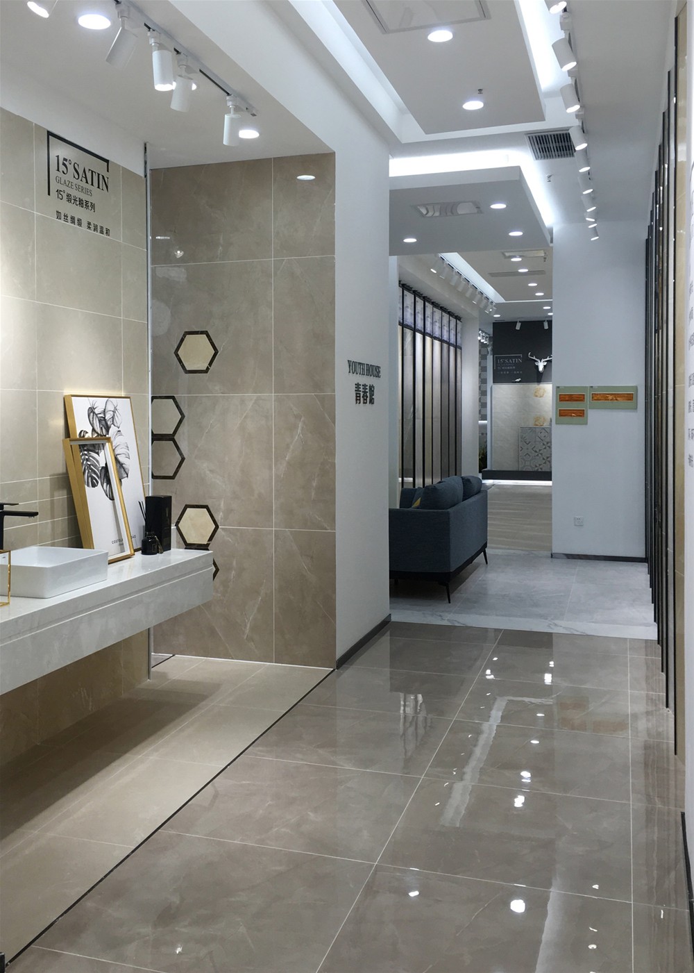 通常选用15°缎光釉、现代仿古砖、九面通体大理石等多面纹理变幻不一的瓷砖,简约却不单调。