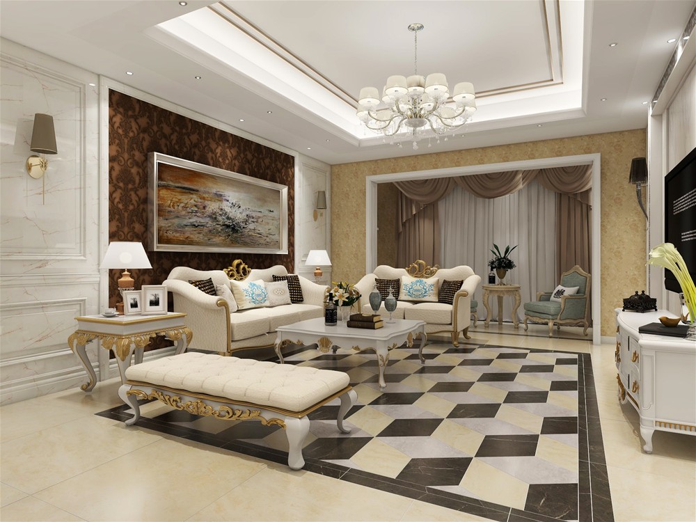 由仿大理石纹理15°缎光釉瓷砖装饰的电视墙,纹理清晰、素雅,地砖由三个颜色铺设的立体图形,让地面更有立体感和设计感。沙发、茶几、电视柜等家具雕饰简洁,更具轻奢感。灯饰摒弃繁杂的水晶吊灯采用相对线条简化的吊灯,完美演绎简欧轻奢品味。