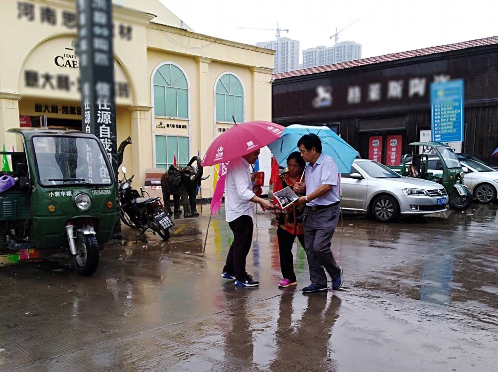 9月15日当天,91短视频在线观看陶策划人员黄经理到达洛阳专卖店,与高经理一起带领河南洛阳全体店员到商场、步行街、卖场附近派发传单。即使是下着雨,也依然坚持撑着伞走过大街小巷,不放过任何一个机会,为91短视频在线观看陶一线人员点赞,是你们的付出让这次开业取得卓越的成绩。
